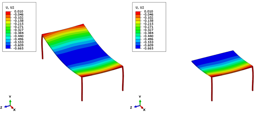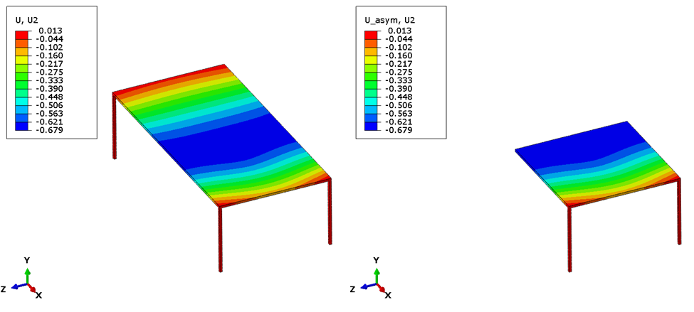 To show that this works, we’ll use a model of a table. We ran the whole table with two downward loads on the left and a half table with one downward load and symmetry on the right and the results are identical: