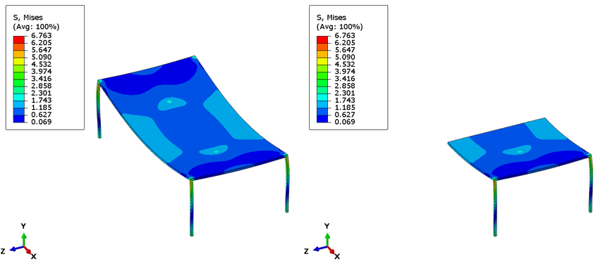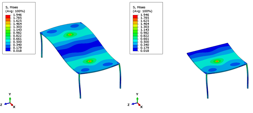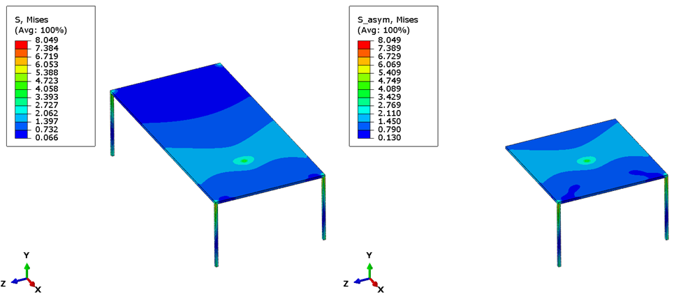 To prove this out, we used the table example – a half table was ran using symmetry and antisymmetry boundary conditions and the stresses and displacements of both were added together. This was compared to a whole table with twice the load. As we can see in the images below, the results are the same.