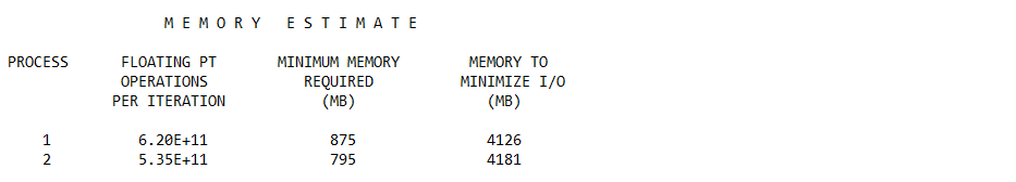 Lastly, the dat file provides some useful information regarding the total size of the problem being solved. This is reported in terms of nodes, elements and variables in the finite element model. Abaqus also estimates the minimum and optimal amount of memory (RAM) required to complete the analysis. This is incredibly useful when running large jobs as it allows the user to select the appropriate hardware to achieve the most efficient solve time. If the “Memory To Minimize I/O” is greater than the available system RAM, then some information must be swapped back and forth between RAM and disk memory, which results in a substantial increase in the analytical solve time.